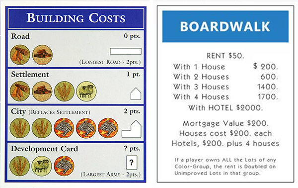 Left: a CATAN Building Costs card. Right: a Monopoly property card.