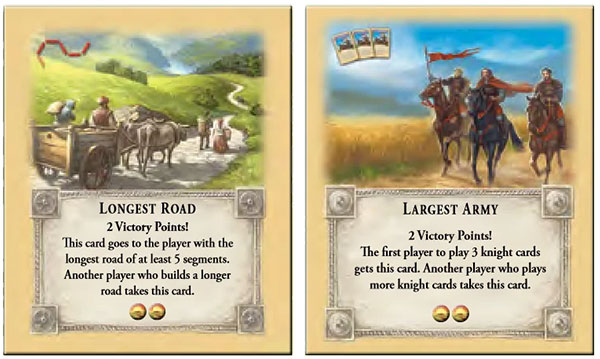 There are additional nuances, of course. One recipe item buys players a Development Card, which could confer points, free roads, or a Knight (originally called a Soldier), which lets a player move a grey robber pawn (which in early editions was painted black – yikes) to any tile on the board, claiming a card from any one player whose settlement borders that region. Any player who rolls a 7, the most common outcome from a pair of six-sided dice, likewise gets to move the robber. Two cardboard tiles labelled Longest Road and Largest Army are awarded to players who maintain 5 or more road segments, or 3 or more Knight cards played. Each of these cards is worth 2 points, but they can be claimed by any player who overtakes the lead in either category. Settlements and cities, which must be placed two edges away from other settlements or cities, can be built to interrupt roads, allowing players to curtail their opponents’ Longest Road bids.