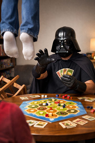 CATAN’s aptly named “Monopoly” development card, which siphons all instances of a certain resource from players’ hands, provides ample cause to flip the table. Players tend to gang up on the points leader. In its final stages, CATAN commits the cardinal board game sin of facilitating “king-making,” where one player who stands no chance of winning can decide to supply crucial resource cards to a leading player, tipping the scales in their favour unfairly.
